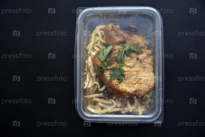 Кусок сочной жареной свинины с приправленной лапшой в контейнере. Вкусный завтрак с мясом и лапшой на черном фоне