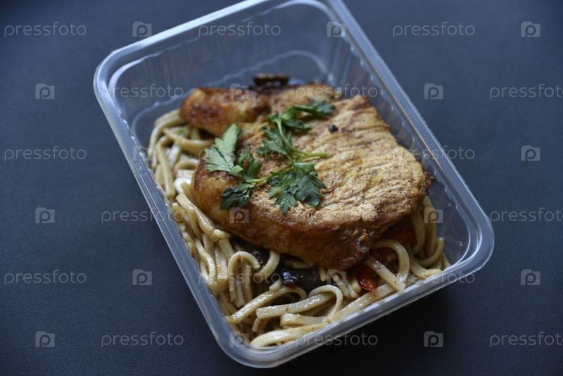 Кусок сочной жареной свинины с приправленной лапшой в контейнере. Вкусный завтрак с мясом и лапшой на черном фоне