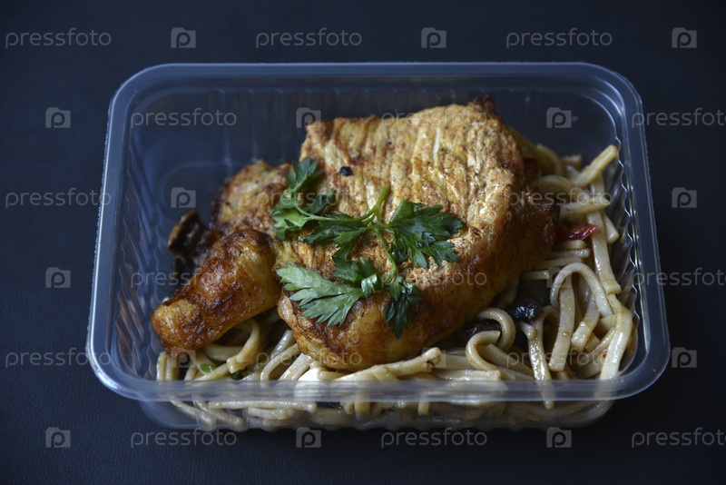 Кусок сочной жареной свинины с приправленной лапшой в контейнере. Вкусный завтрак с мясом и лапшой на черном фоне