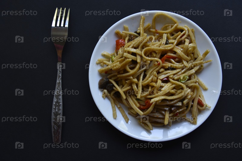 Вкусная приправленная лапша лагман на белой тарелке на черном фоне. Вкусный завтрак из лапши и перца