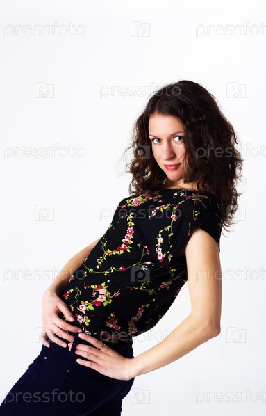 Молодая красивая женщина позирует в студии на светлом фоне