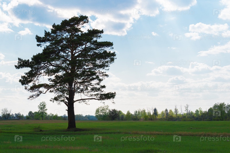 Одинокое дерево стоящее в поле над голубым небом с облаками и светящими лучами солнца