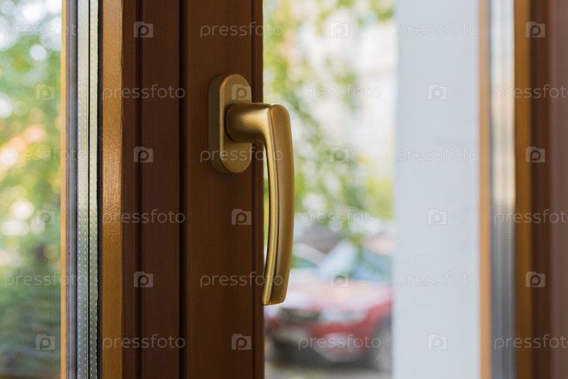 Золотая ручка у коричневой деревянной оконной двери с зелеными листьями и красной машиной на заднем плане