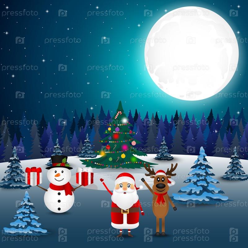 Счастливый снеговик с подарками. Санта-Клаус и олени приветствуют