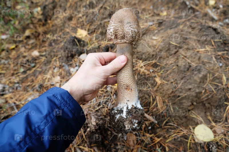 Съедобный грибной зонтик macrolepiota procera в руке в осеннем лесу, крупный план
