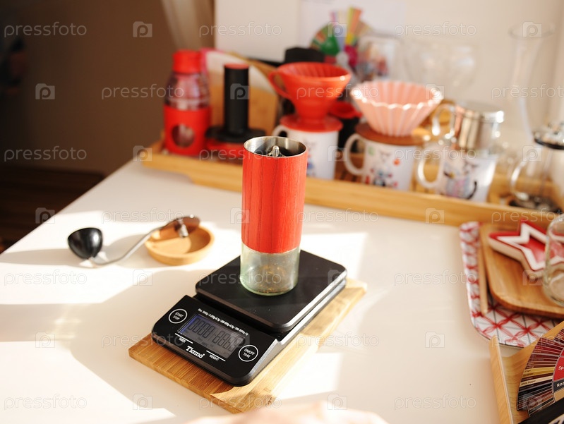 Альтернативный пивоваренный натюрморт. Красная ручная кофемолка на электронных весах. Концепция специализированной эстетики третьей волны