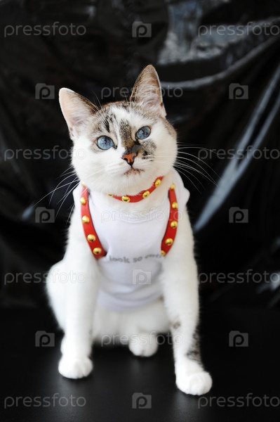 Белый голубоглазый милый кот, одетый в футболку и красную кожаную упряжь. Стильный наряд с аксессуарами. Черный фон