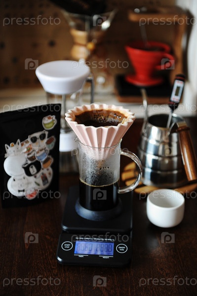 Альтернатива ручному завариванию кофе в розовой керамической капельнице оригами с бумажным фильтром. Гриндер. Чайник на гусиной шее. Электронные весы