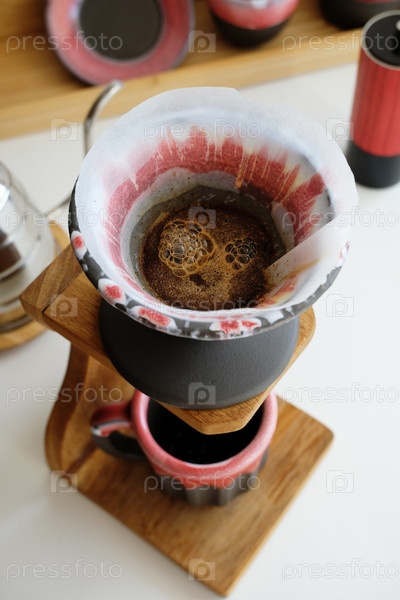 Заваривание кофе в горшечном наборе из керамической глины: капельница v60 и кружка на деревянной подставке
