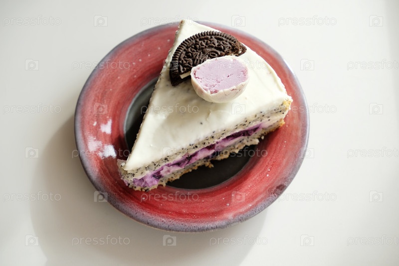 Кусок пирога на тарелке на белом фоне, вид сверху. С маком, черникой, белым шоколадом