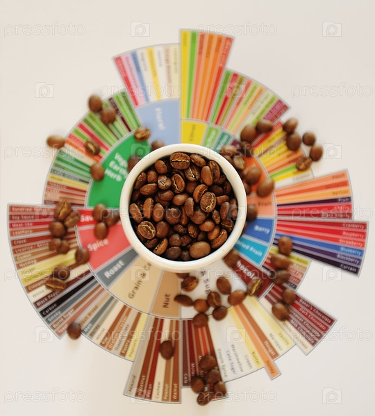 Концепция специального кофе. Жареные кофейные зерна в белой чашке на колесе вкуса дегустатора. Вид сверху