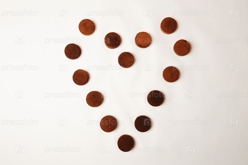 Сердце выложено из шайб кофе эспрессо на белом фоне. Изолированные, вид сверху