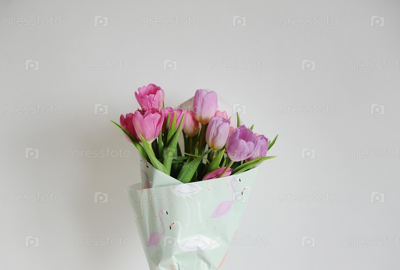 Букет нежных цветов тюльпанов на белом фоне. оберточная бумага фламинго