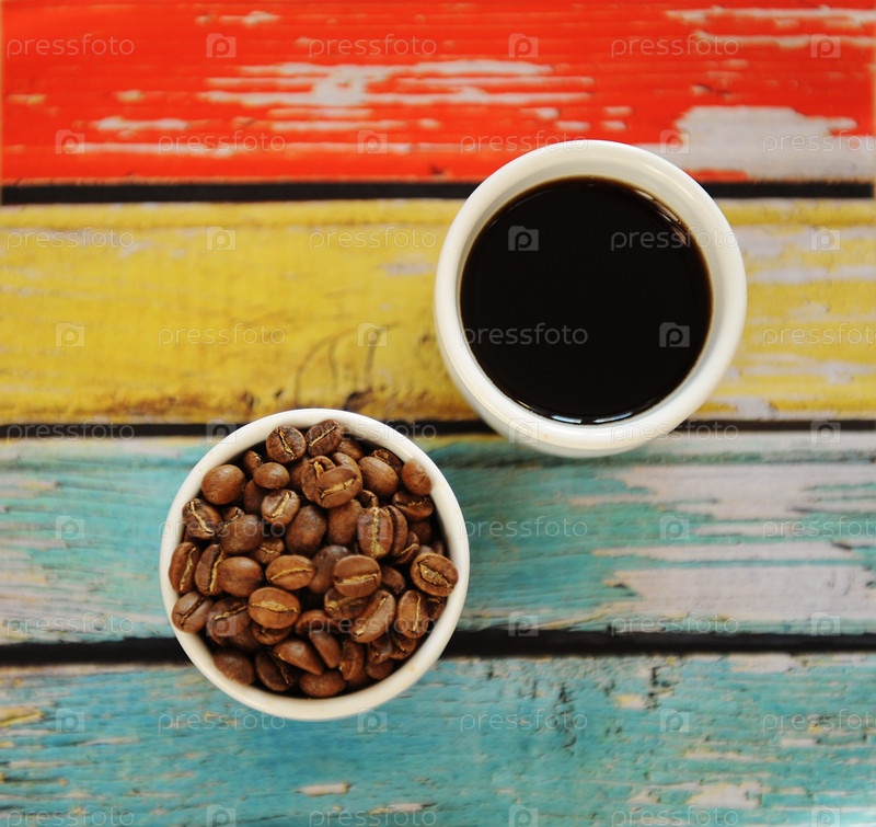 Жареные бобы и черный кофе в двух белых чашках сверху. Красочный полосатый деревянный фон