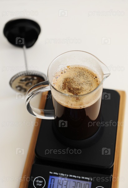 Заваривание кофе во френч-прессе. На черных электронных весах таймера