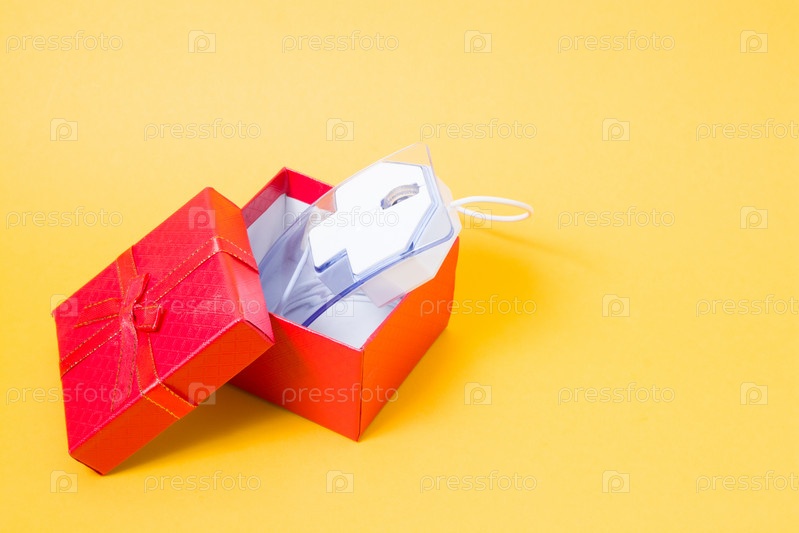 Концепция онлайн-покупок, компьютерная мышь из прозрачного пластика в красной коробке с бантом, желтый фон, место для копирования, покупка подарка в Интернете