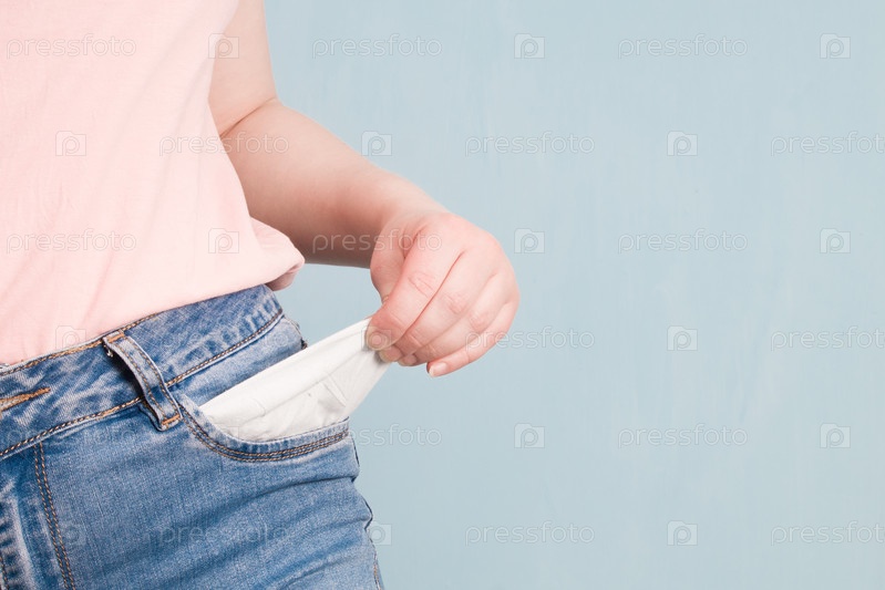 Женщина показывает пустой карман джинсов, концепцию финансовых проблем, кризис и газ, концепцию безработицы, синий фон, пространство для копирования