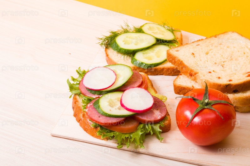 Бутерброд с овощами и диетической колбасой на деревянной разделочной доске, деревянный стол, хлеб и овощи на заднем плане, концепция здорового завтрака, пространство для копирования