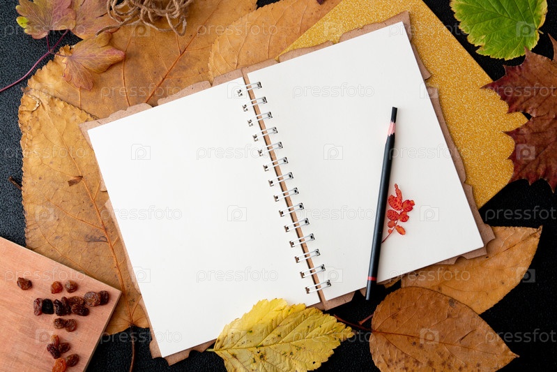 Карандаш на чистом блокноте жарить осенние листья на черном фоне копией пространства вид сверху