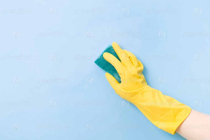 Рука в желтой резиновой перчатке держит желтую губку с зеленой шероховатой стороной для очистки сложной грязи, пространство для копирования на синем фоне, концепция уборки, уход за домом, весенняя уборка
