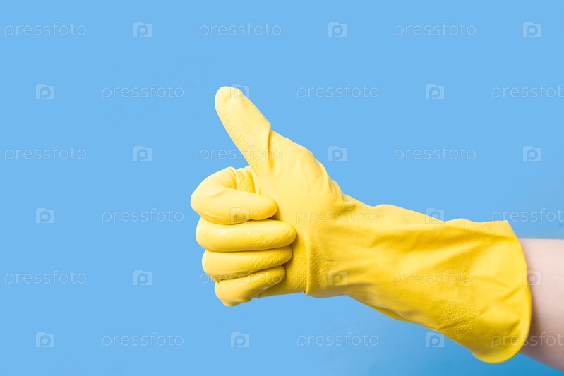 Рука в желтой резиновой перчатке для чистки с поднятым большим пальцем вверх на синем фоне копировального пространства, знак ок, жест одобрения и, как концепция знака, домашнее задание выполнено