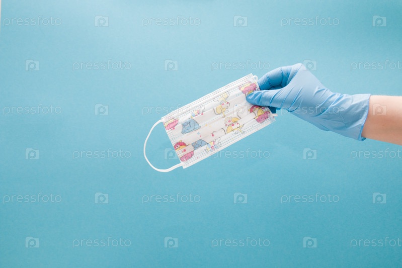 Женская рука держит детскую медицинскую защитную маску с рисунками на синем фоне копировального пространства, рука в синих перчатках, защита от болезней, передающихся воздушно-капельным путем, концепция формулы коронавируса