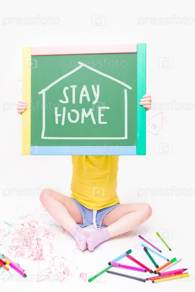 Ребенок в желтой футболке и синих шортах держит зеленую доску со словами "оставайся дома", белый фон с детскими рисунками, карантинные мероприятия с детьми