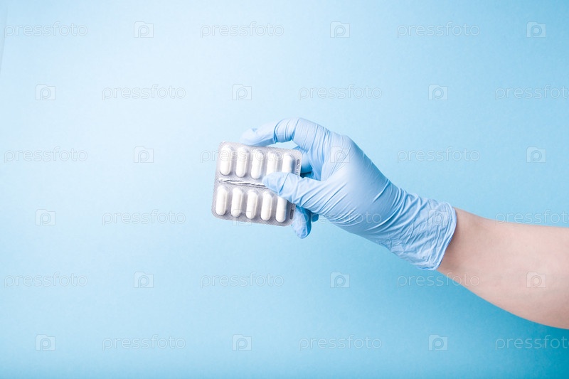 Рука в синей одноразовой медицинской перчатке держит волдырь с белыми капсулами на синем фоне