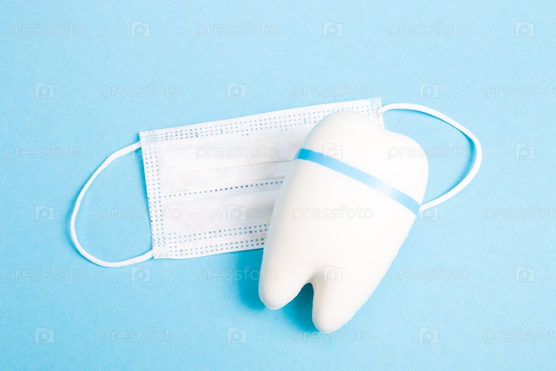 Модель белого зуба и детская медицинская висцеральная маска на синем фоне копировального пространства, концепция стоматологии, лечение зубной боли