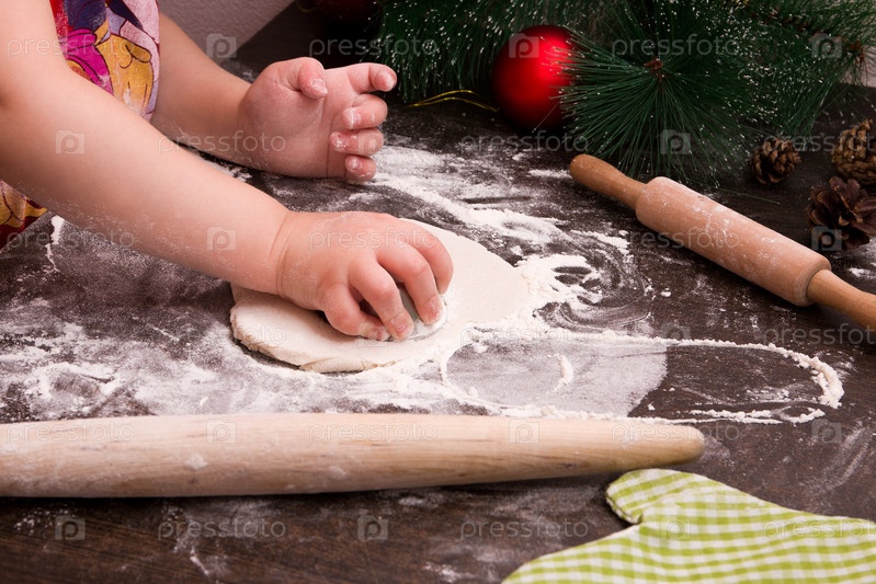 Маленькая девочка делает рождественское печенье, новогодний фон, яркие цвета, красные елочные украшения, копия пространства