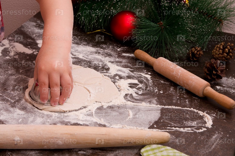 Рука маленькой девочки делает рождественское печенье, новогодний фон, яркие цвета, красные елочные украшения, копия пространства