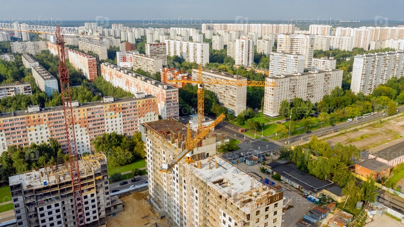 Строятся новые высотные многоквартирные дома. Аэрофотоснимок солнечным вечером