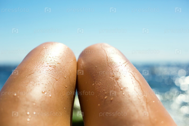 Гладкие загорелые женские ножки в брызгах воды на пляже на фоне моря. Средства для загара, защита от загара, уход за кожей, депиляция, пляжный отдых. Копировать пространство