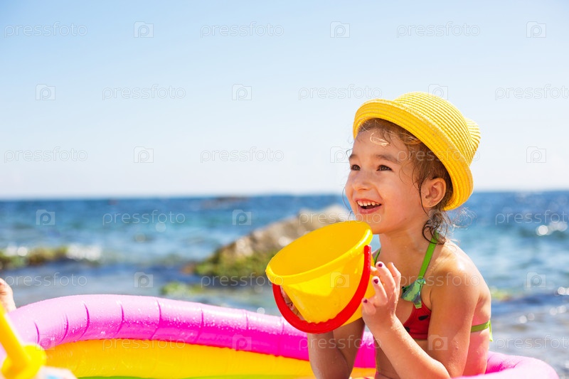 Девушка в желтой соломенной шляпе играет с ветром, водой и диспенсером для воды в надувном бассейне на пляже. Несмываемые средства для защиты детской кожи от солнца, солнечных ожогов. курорт на море