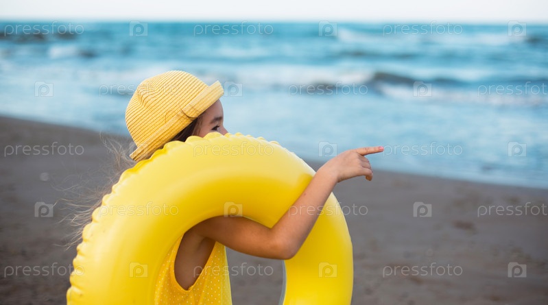 Девушка с желтым надувным кругом на берегу моря. Отдых на пляже, летние путешествия