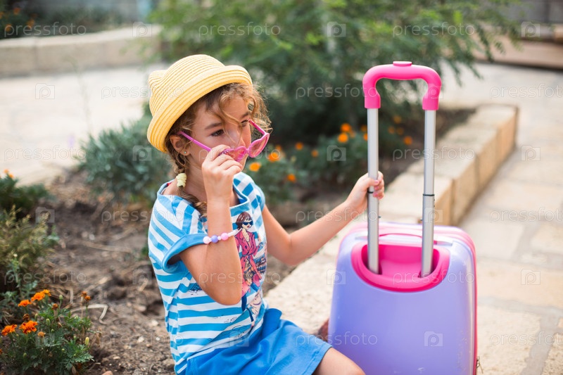 Девушка с чемоданом, шляпой и солнцезащитными очками собирается в отпуск. Ожидание поездки, прибытие на место проживания в гостиницу