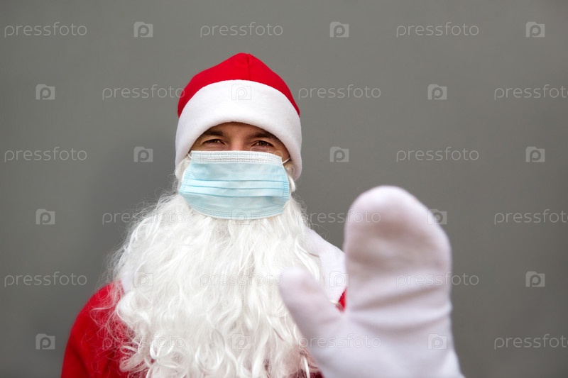 Санта-Клаус с белой бородой в красном пальто в медицинской маске. Рождество в условиях пандемии коронавируса, сезонных болезней, ОРВИ и пневмонии в праздничные дни. Защита от вирусов в новом году. Серый фон