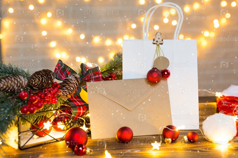 Конверт из крафт-бумаги с поздравлением и приглашением на Рождество и новый год в праздничном декоре, гирляндах. Письмо для Деда Мороза. Макет, натуральный декор, ручная работа. Копировать пространство