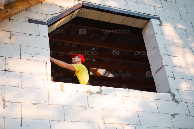 Строитель на строительной площадке измеряет длину оконного проема и кирпичной стены рулеткой. Коттедж из ячеистых бетонных блоков, спецодежда - комбинезон и бейсболка
