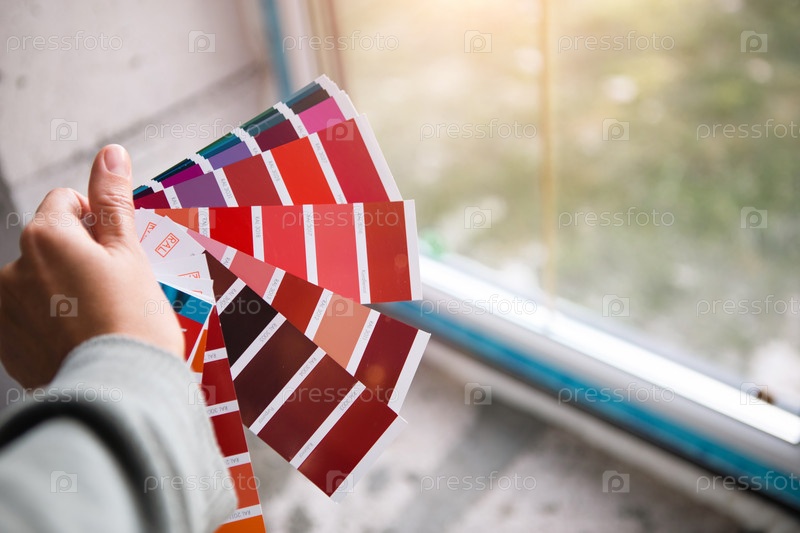Подбор цвета краски для декоративного ремонта дома по палитре с макетами. Вентилятор оттенков в руке внутри дома. Ремонтно-строительные, лакокрасочные покрытия