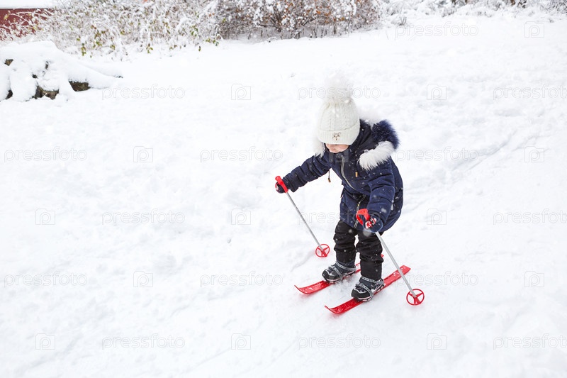 Детские ножки в красных пластиковых лыжах с палками идут по снегу с горки-зимний вид спорта, семейное развлечение на свежем воздухе. Маленькая девочка скользит по склону с раннего возраста. Копировать пространство