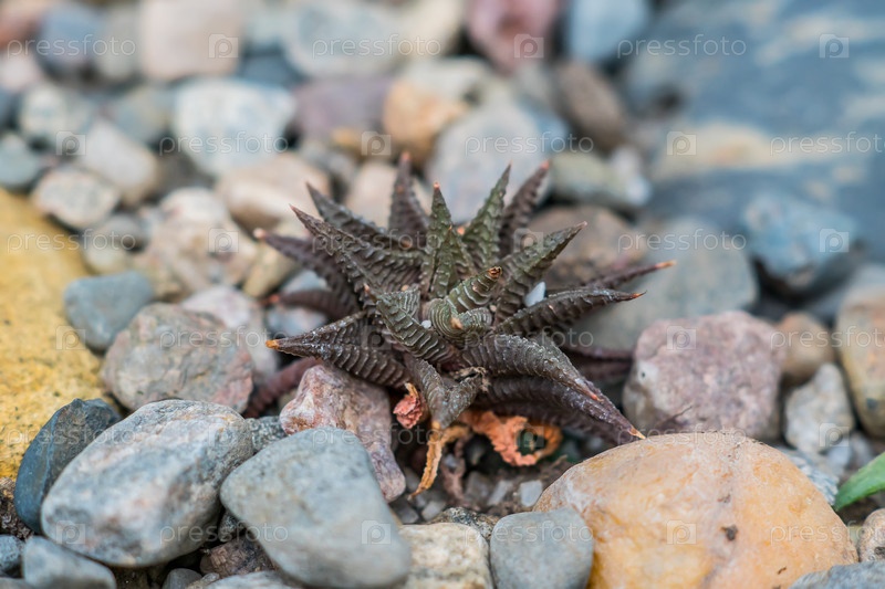 Крошечные суккуленты или кактусы в пустынном ботаническом саду и на фоне каменной гальки