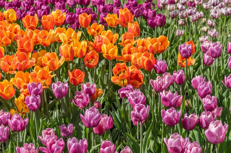 Свежие красочные цветущие розовые и оранжевые тюльпаны в весеннем саду