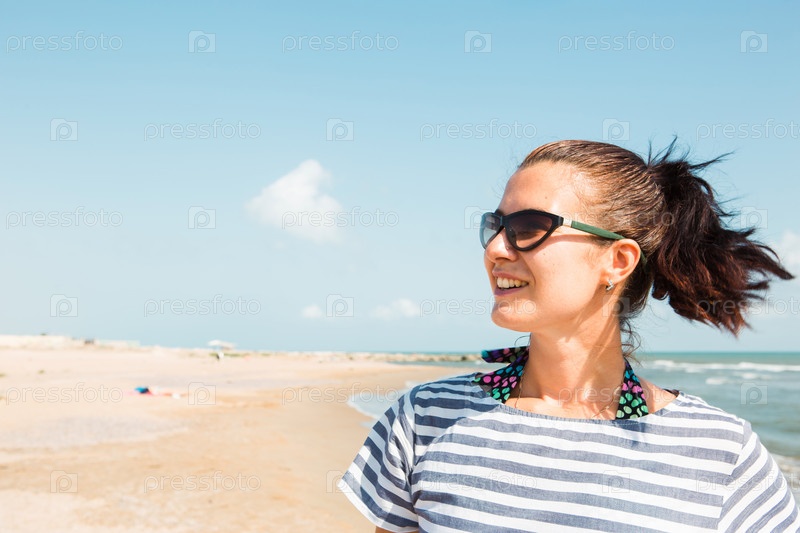 Портрет крупным планом счастливая брюнетка в полосатом платье в солнечных очках стоит у моря, смотрит на волны, смеется и улыбается. Туризм, пляжный отдых, ветер, путешествия, путешествия