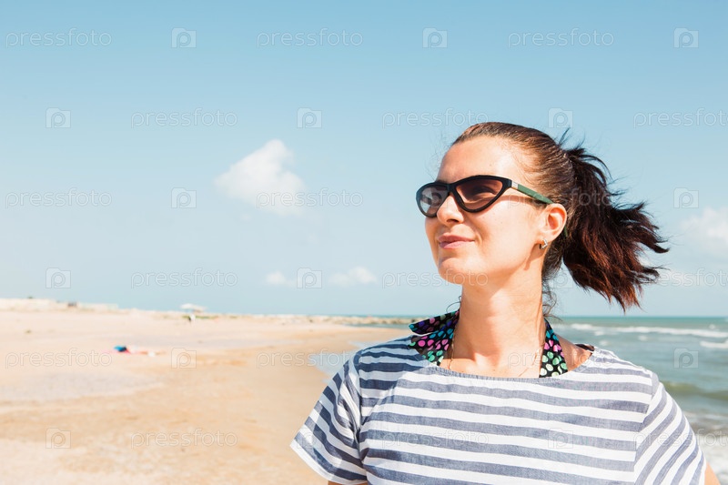 Портрет крупным планом счастливая брюнетка в полосатом платье в солнечных очках стоит у моря, смотрит на волны, смеется и улыбается. Туризм, пляжный отдых, ветер, путешествия, путешествия