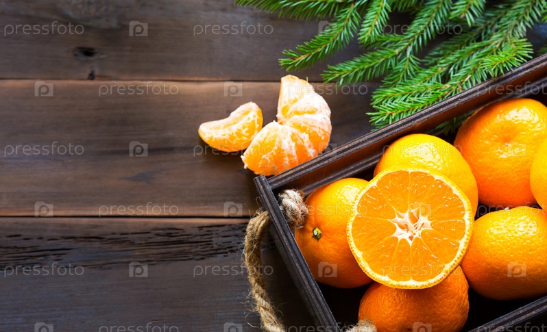 Свежие мандарины в коричневой коробке на деревянном фоне с зелеными еловыми ветками. Рамка, пространство для копирования, праздничный и зимний аромат, новый год, Рождество. Здоровое питание, апельсиновый сок, витрина. Нарезать и вырезать