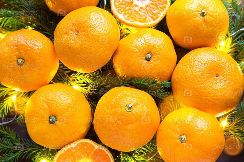 Свежие мандарины в гирляндах, на еловых ветках и мишуре - яркий новогодний фон. Половинка апельсина, цитрусовый аромат праздника. Рождество, Новый год. Место для текста