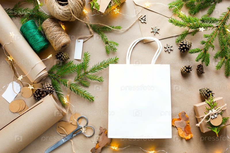 Подарочная упаковка к Рождеству и Новому году из экологически чистых материалов: крафт-бумага, живые еловые ветки, шишки, шпагат. Теги с макетом, натуральный декор, ручная работа, сделай сам. Скопируйте пространство. Плоско, фон