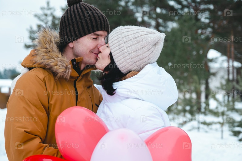 Влюбленные мужчина и женщина целуются на свидании на свежем воздухе зимой в снегу с подарком розовых и красных воздушных шаров в форме сердца. День святого Валентина, любовь, счастливая влюбленная пара на прогулке
