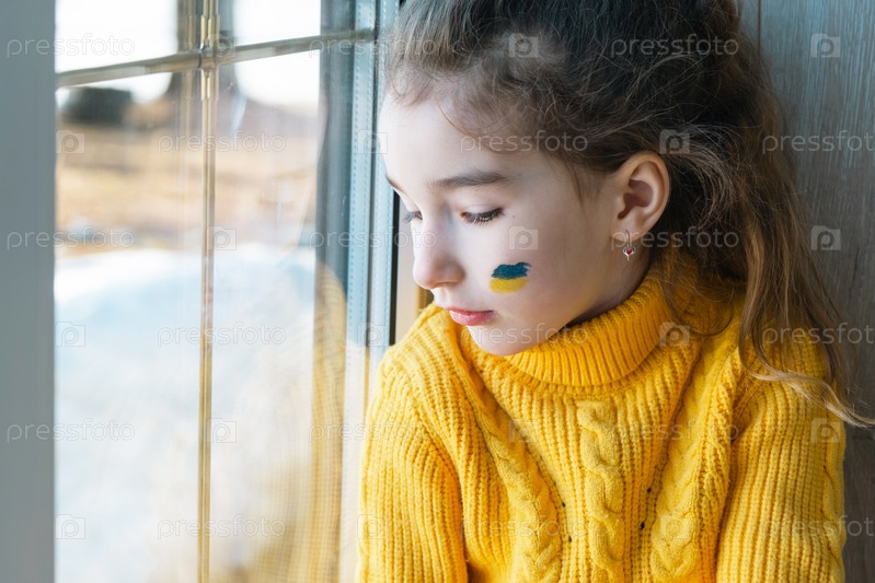 Грустный ребенок смотрит в окно с нарисованным на щеке флагом Украины, беспокоится и боится. Гуманитарная помощь детям, мир во всем мире, безопасность